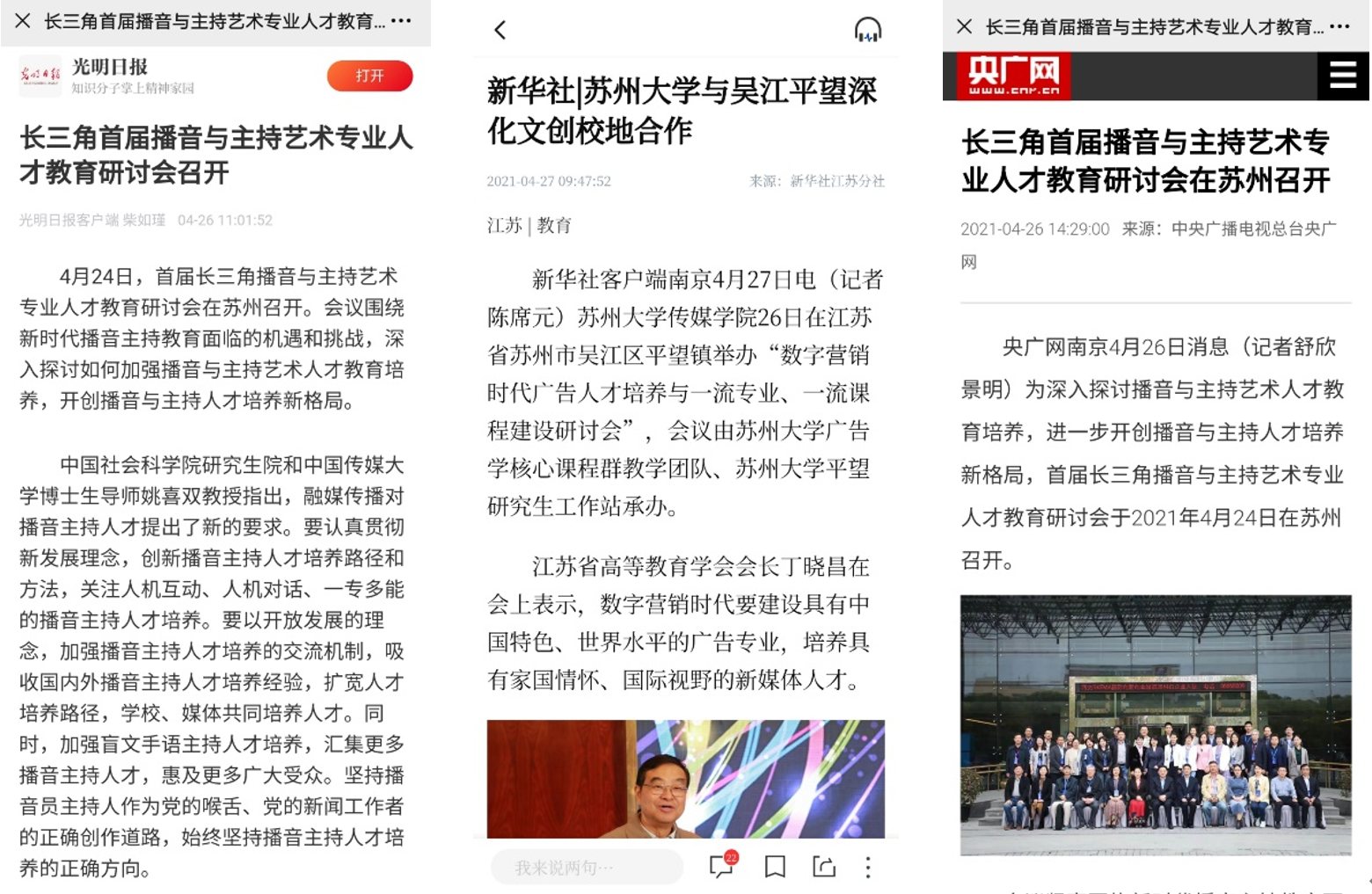 近日,由傳媒學(xué)院牽頭舉辦的“首屆長三角地區(qū)播音與主持藝術(shù)專業(yè)人才教育研討會”在吳江區(qū)平望鎮(zhèn)舉行,《光明日報》、央廣網(wǎng)等中央級媒體予以報道關(guān)注。新華社客戶端則報道了同樣在平望鎮(zhèn)舉辦的“數(shù)字營銷時代廣告人才培養(yǎng)與一流專業(yè)、一流課程建設(shè)研討會”。