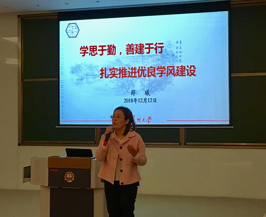 最后,薛曦以 “學思于勤,善建于行,扎實推進優良學風建設”為主題做總結發言。她分析了當前學院學風建設存在的問題和原因,介紹了學院在學風建設層面強化日常管理、穩定專業思想、推動學術交流、增進朋輩教育、鼓勵科研創新、嚴肅考風考紀、豐富第二課堂等有益探索,并分享了今后學風建設的思路和方向。她強調學生工作目標是使不和諧的學生變和諧(托底),使和諧的學生更卓越(引領),呼吁學生工作既要有“愛”與“陪伴”,也要“講規矩”,要確保“公正透明”,有“責任與擔當”,培養德、智、體、美、勞全面發展的社會主義建設者和接班人。
