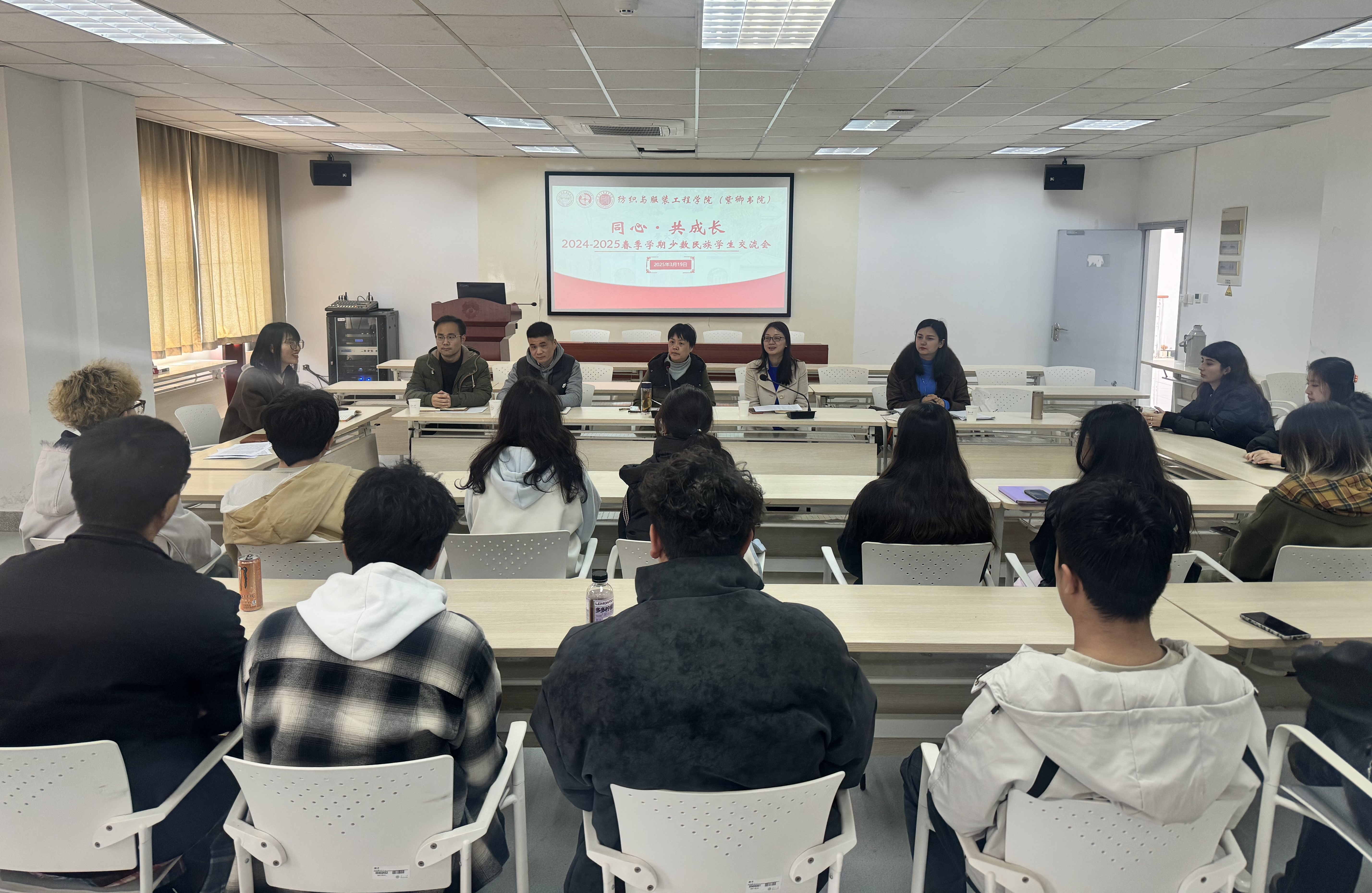 3月19日下午,紡織與服裝學院(紫卿書院)“同心·共成長”2024-2025春季學期少數民族學生交流會在工科樓舉行。黨委學生工作部(處)副部(處)長黎春虹,紡織與服裝工程學院黨委副書記、副院長虞嵐,黨委保衛部(保衛處)政治保衛科科長石峰、孫金強,“紅石榴”輔導員工作室教師買合蘇旦、文璐,優秀學生代表及全體新疆籍少數民族學生齊聚一堂,聚焦鑄牢中華民族共同體意識主線,圍繞學生成長需求,共話生涯規劃藍圖。交流會由學院學生工作辦公室主任季彥斐主持。