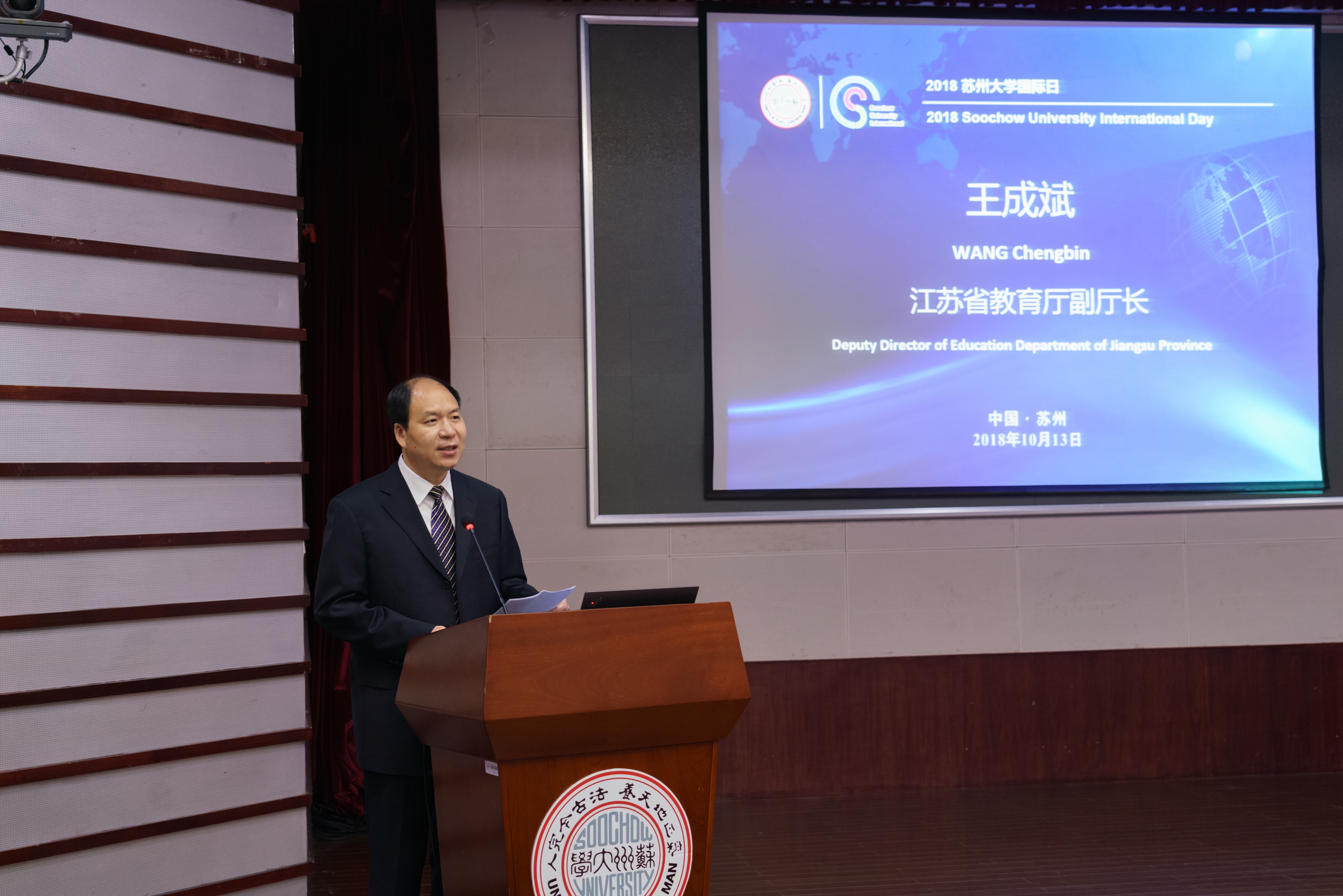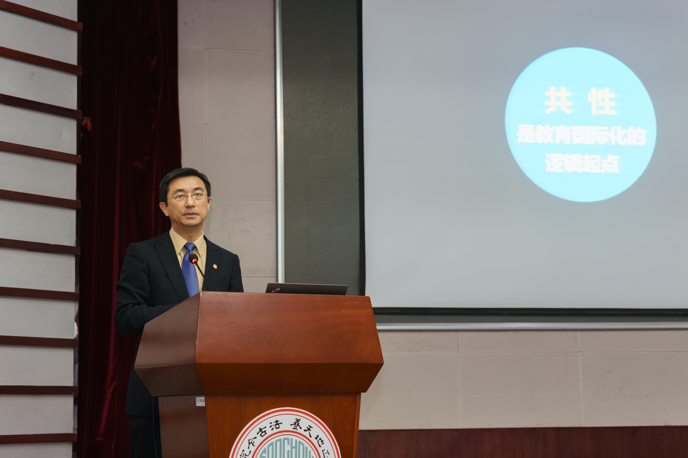 王成斌副廳長致開幕辭。他指出,全球化、國際化已成為當今世界教育發展的重要趨勢和鮮明特點,教育能夠培養出更多具有國際視野、通曉國際規則、具有創新精神和實際能力的各類人才。對于未來江蘇教育的對外開放發展,他指出,要緊緊圍繞國家外交大局和江蘇的對外開放而展開,要以發展具有中國特色、國際水平的江蘇教育而展開,要緊緊圍繞培養國際視野和國際競爭力的人才而展開。王成斌副廳長充分肯定了近年來我校國際化工作取得的發展成績,并希望學校今后能進一步彰顯學校的國際化特色,為學校“雙一流”大學的建設,為提高學校辦學質量,為服務國家和區域經濟社會發展需要作出應有的貢獻。