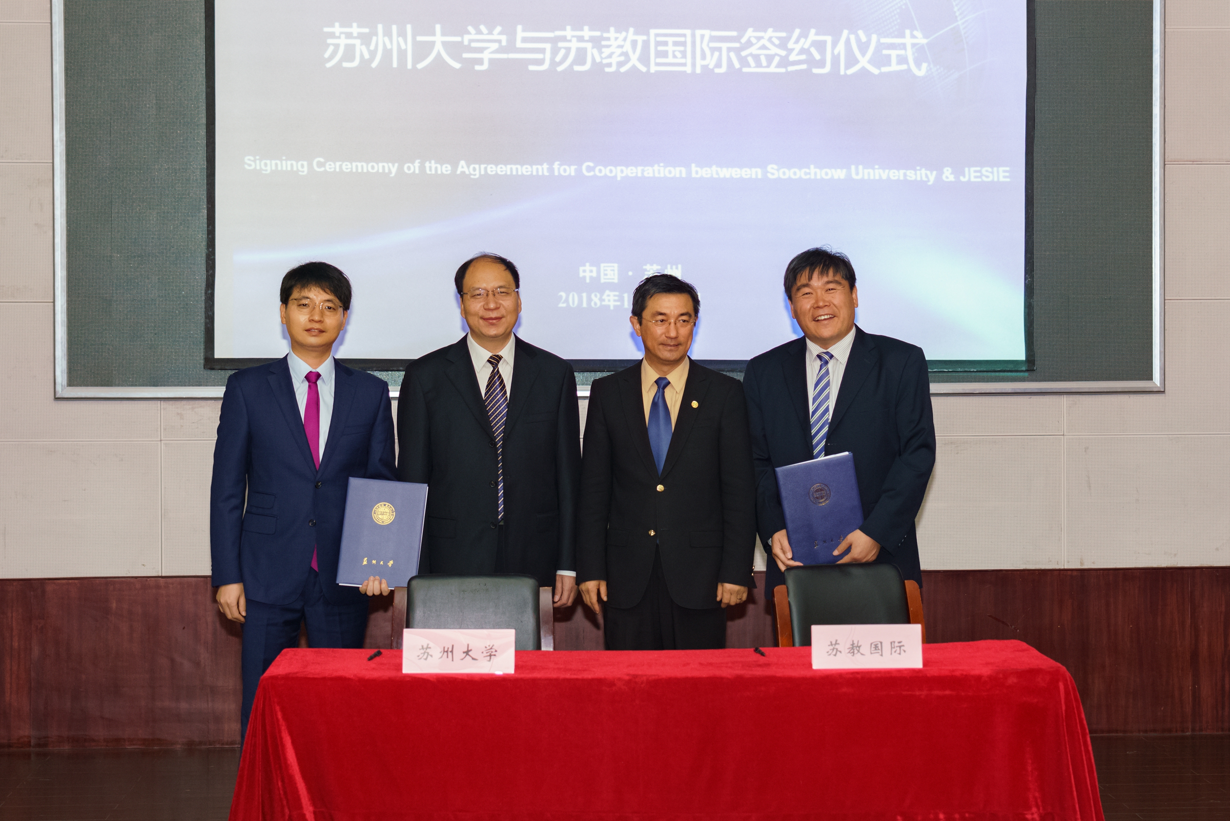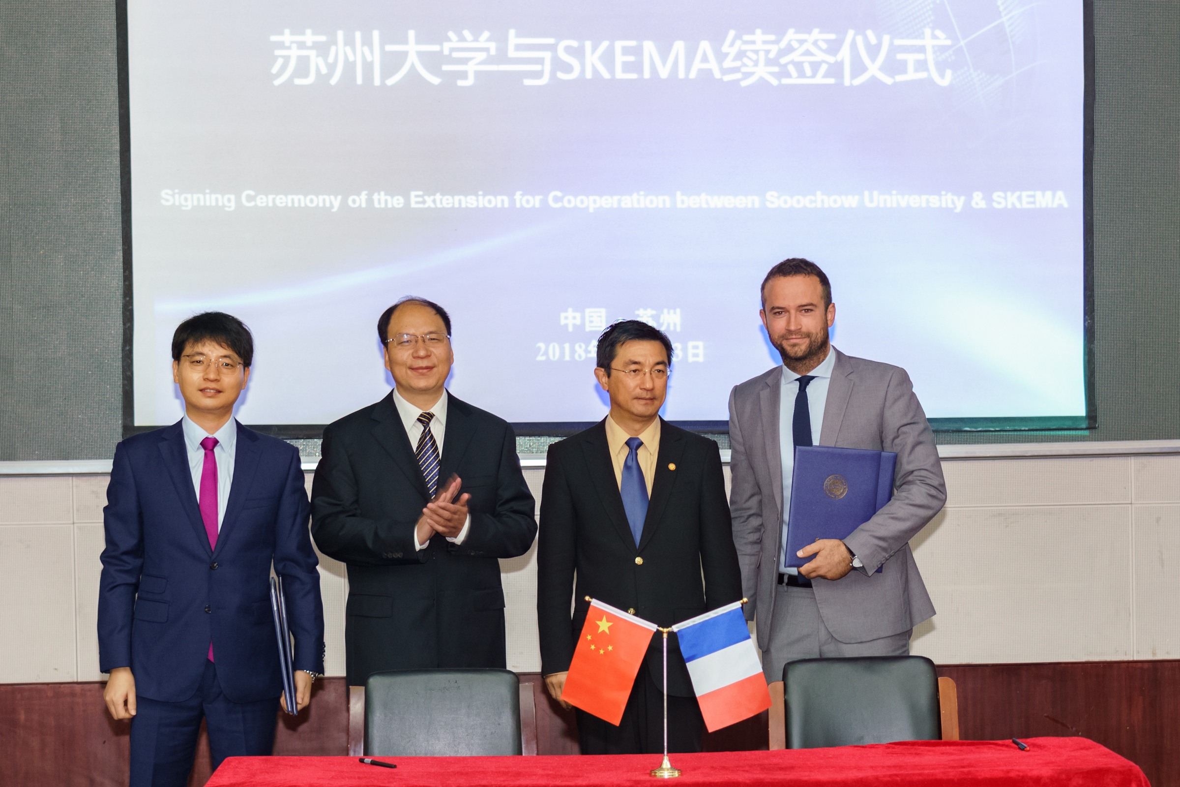 論壇上,《蘇州大學2017年國際化白皮書》正式對外發布。在與會嘉賓的見證下,江蘇省教育國際交流中心主任田一聚和我校國際合作交流處處長張橋簽署戰略合作協議。SKEMA商學院中國校區校長杜睿天和張橋續簽兩校合作備忘錄和學生聯合培養合作協議。