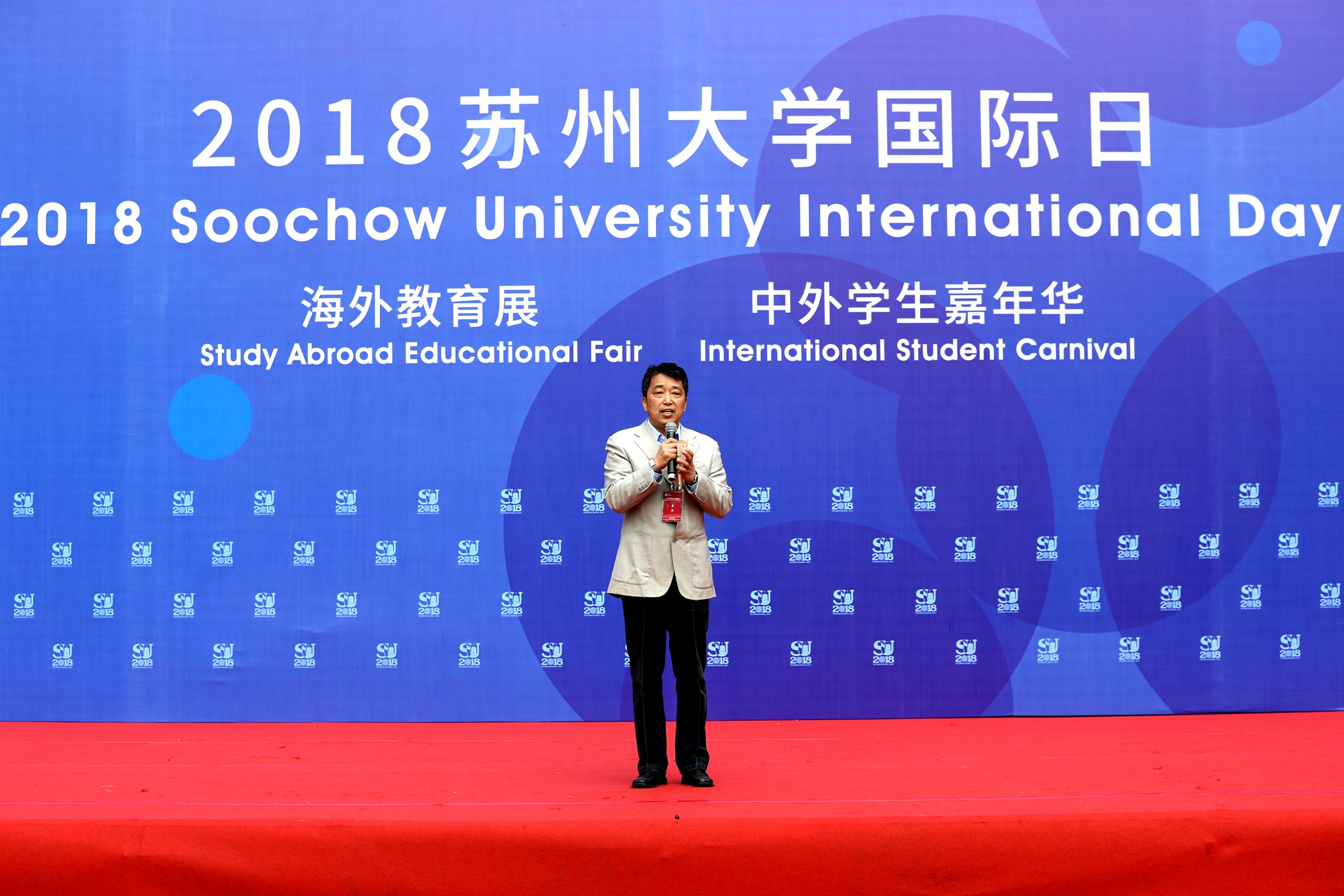 俞曉南副會長致辭。他說,蘇州大學舉辦首屆國際日活動,彰顯了學校在對外開放、國際合作交流方面的優勢和影響力。此次活動的內容豐富,形式多樣,受到了廣大師生的歡迎,為豐富校園生活,促進中外學生交流,增進彼此友誼,提供了良好的平臺。希望每位學生在活動中抓住機會,多方了解目前蘇大與海外院校的合作項目,體驗各國學生帶來的異國風情,品嘗不同國家的美食,多結識朋友、結下友誼,為自己的大學生活留下難忘而又幸福的回憶。