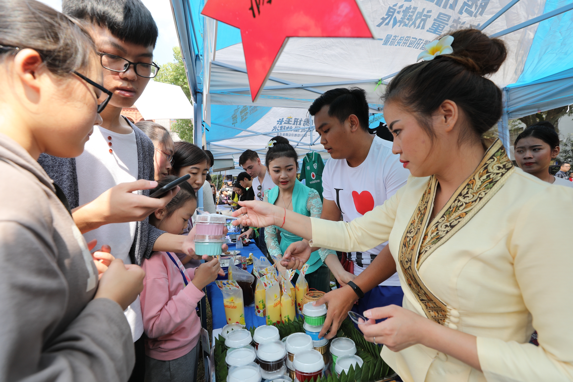 不僅海外教育展受歡迎,活動現場,美食展臺也擠滿了師生。來自22個國家的中外學生獻上了豐富多彩的風情展、美食展和才藝秀。尼日利亞的五色飯、愛爾蘭的奶酪、韓國拌飯、印度尼西亞的黃金糕等百余種美食讓人眼花繚亂,垂涎不已。來自越南的阮氏芰同學一大早就和同伴們忙碌起來,準備食材和調料,他們準備的越南炸春卷和生春卷深受大家喜愛,很快就被搶購一空。“雖然很忙,大家都很高興,能夠和這么多國家的學生一起交流文化,感覺很自豪和溫暖。” 阮氏芰同學笑著說。