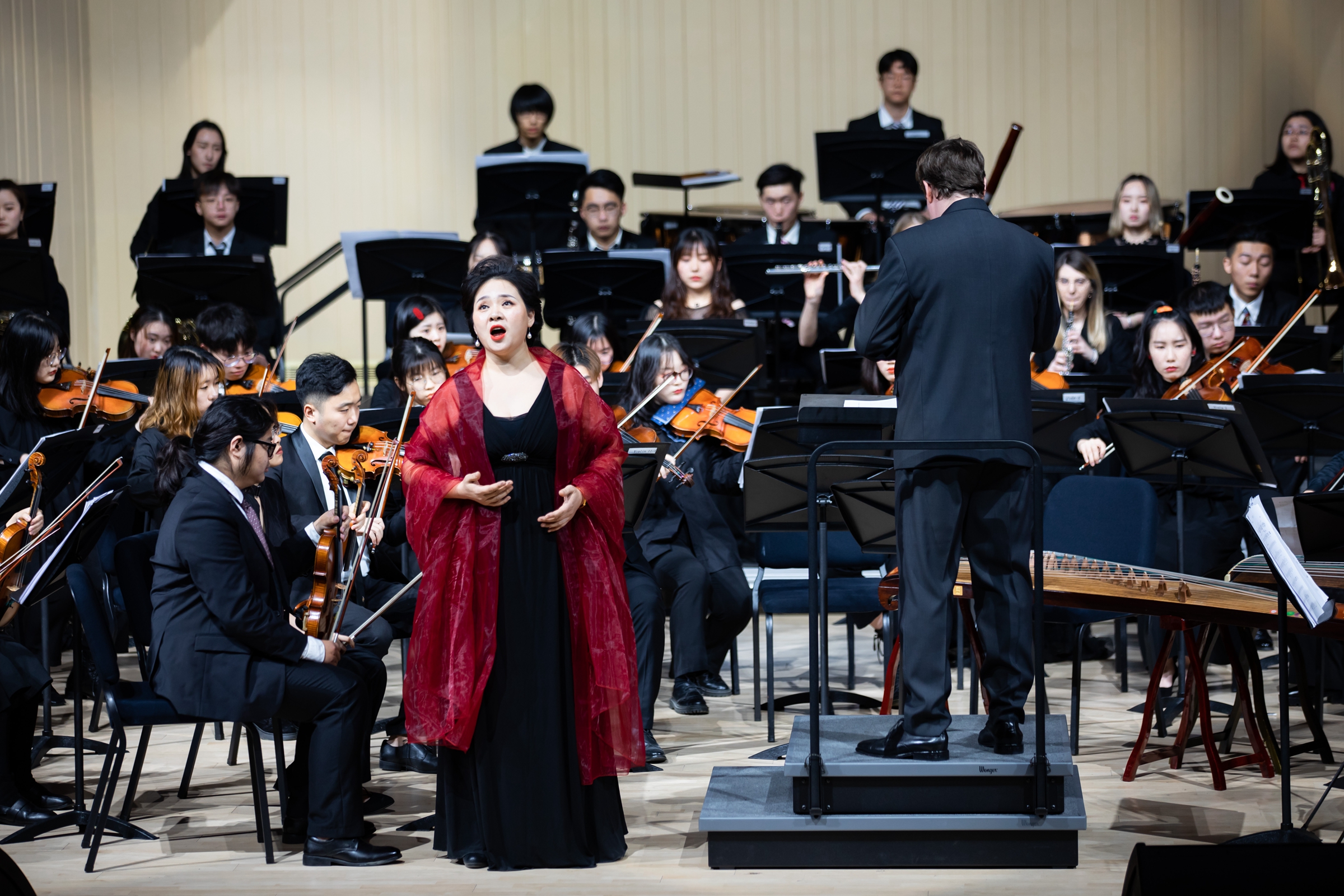 音樂會特別呈現了兩部由蘇州大學音樂學院作曲專業教師創作的作品:《請別忘了她》《幻想伎樂天》,并進行了世界首演。女高音與交響樂隊作品《請別忘了她》是音樂學院唐榮副教授為了紀念蘇州大學黨員英烈、校友白丁香烈士而作,作品獲得江蘇省級、蘇州市級等多個獎項。音樂學院聲樂教師董藝媛與交響樂團合作,深情演唱了這部作品。