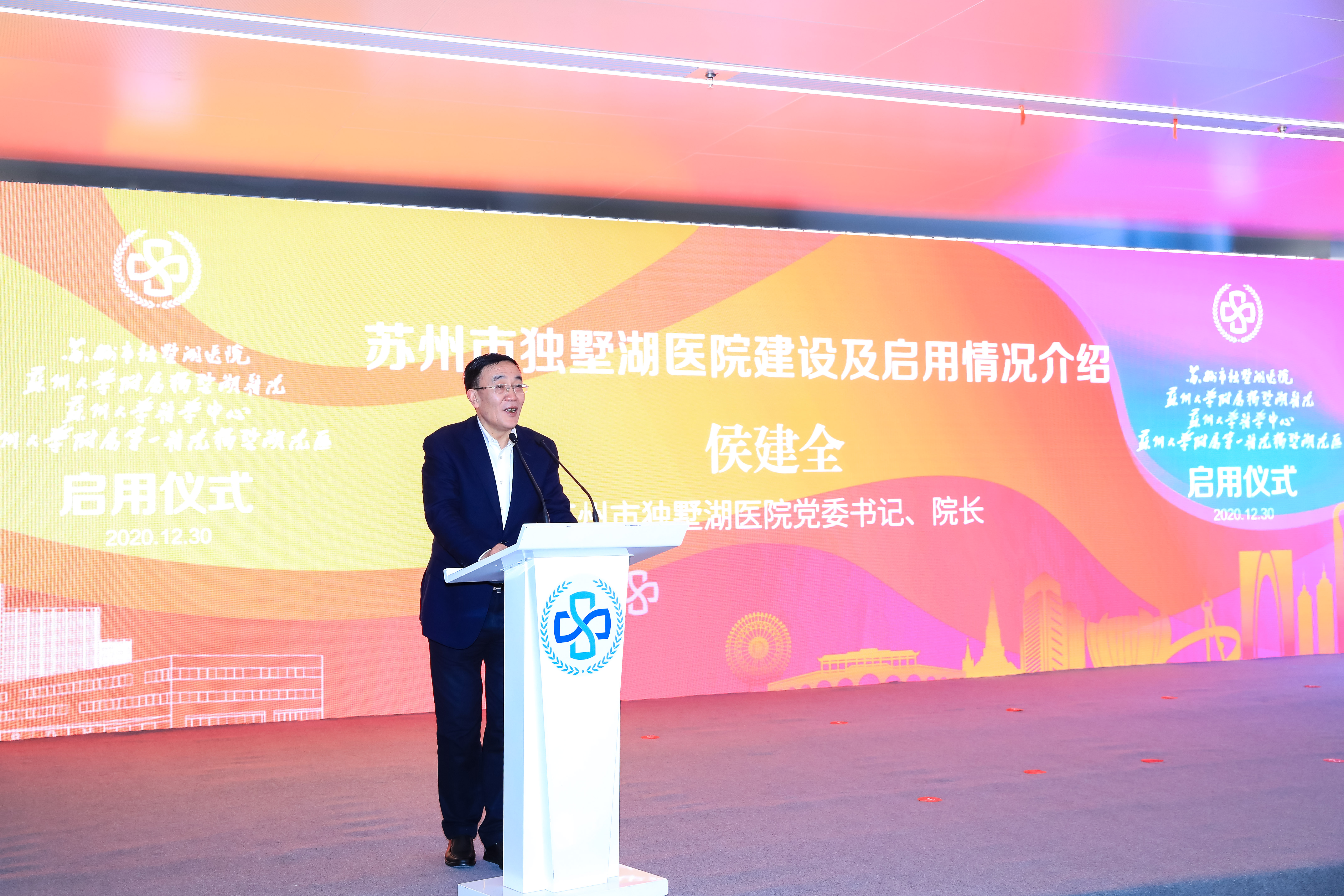 12月30日,蘇州大學附屬獨墅湖醫院(蘇州市獨墅湖醫院)正式啟用。江蘇省委常委、蘇州市委書記許昆林,中科院院士、復旦大學附屬中山醫院心內科主任葛均波,中科院院士、復旦大學附屬婦產科醫院主任醫師黃荷鳳,蘇州市委副書記、市長李亞平,省衛健委副主任、省中醫藥管理局局長朱岷,市委常委、副市長王翔, 市委常委、蘇州工業園區黨工委書記吳慶文, 市委常委、秘書長俞杏楠,副市長曹后靈,市政府秘書長周偉,我校校長熊思東,副校長楊一心,副校長、蘇州大學附屬第一醫院黨委書記陳衛昌,以及蘇州市相關部門和我校職能部門、學院(部)負責人、獨墅湖醫院領導和工作人員出席活動。蘇州工業園區黨工委副書記、管委會副主任、政法委書記吳宏主持儀式。