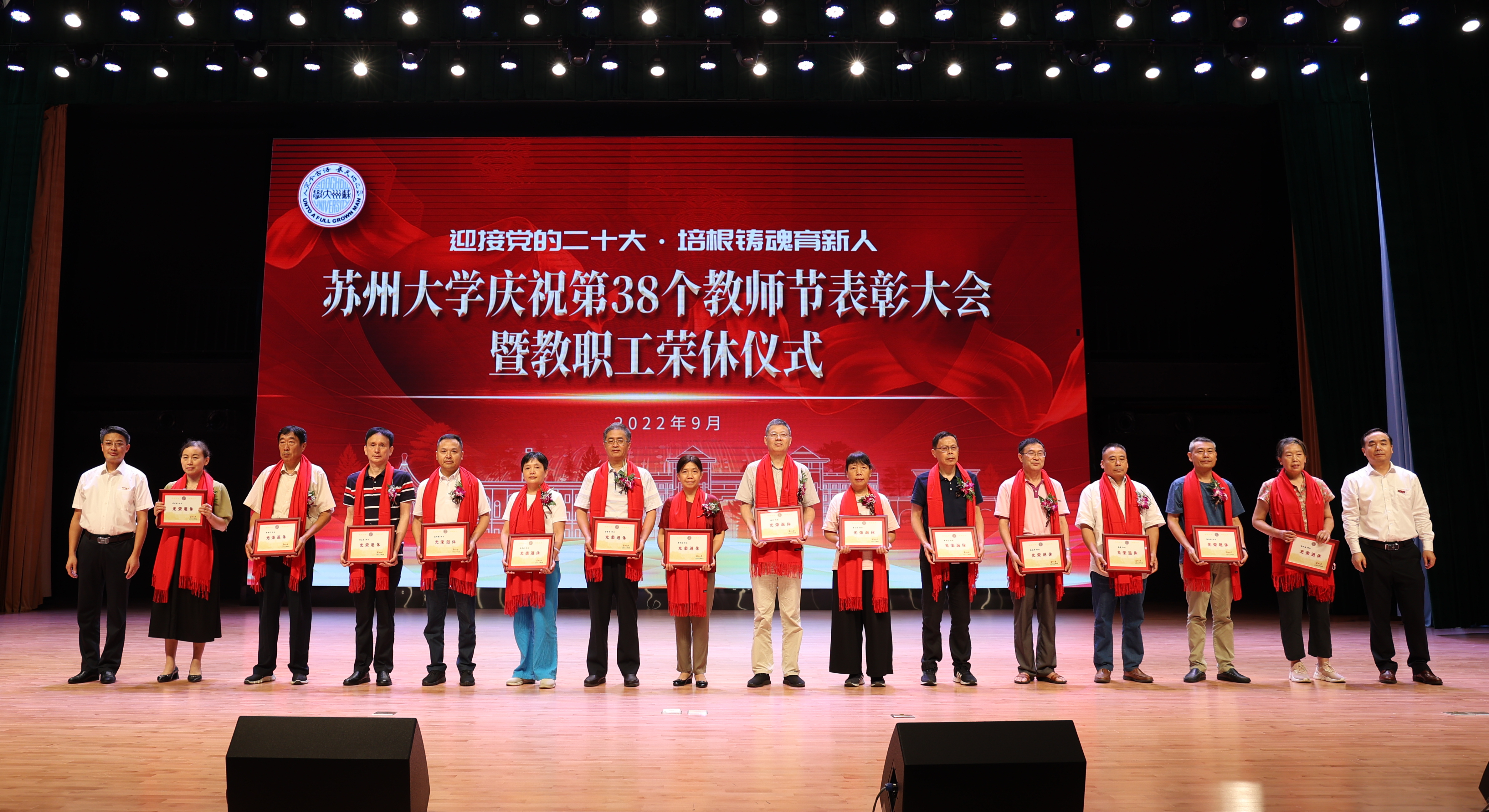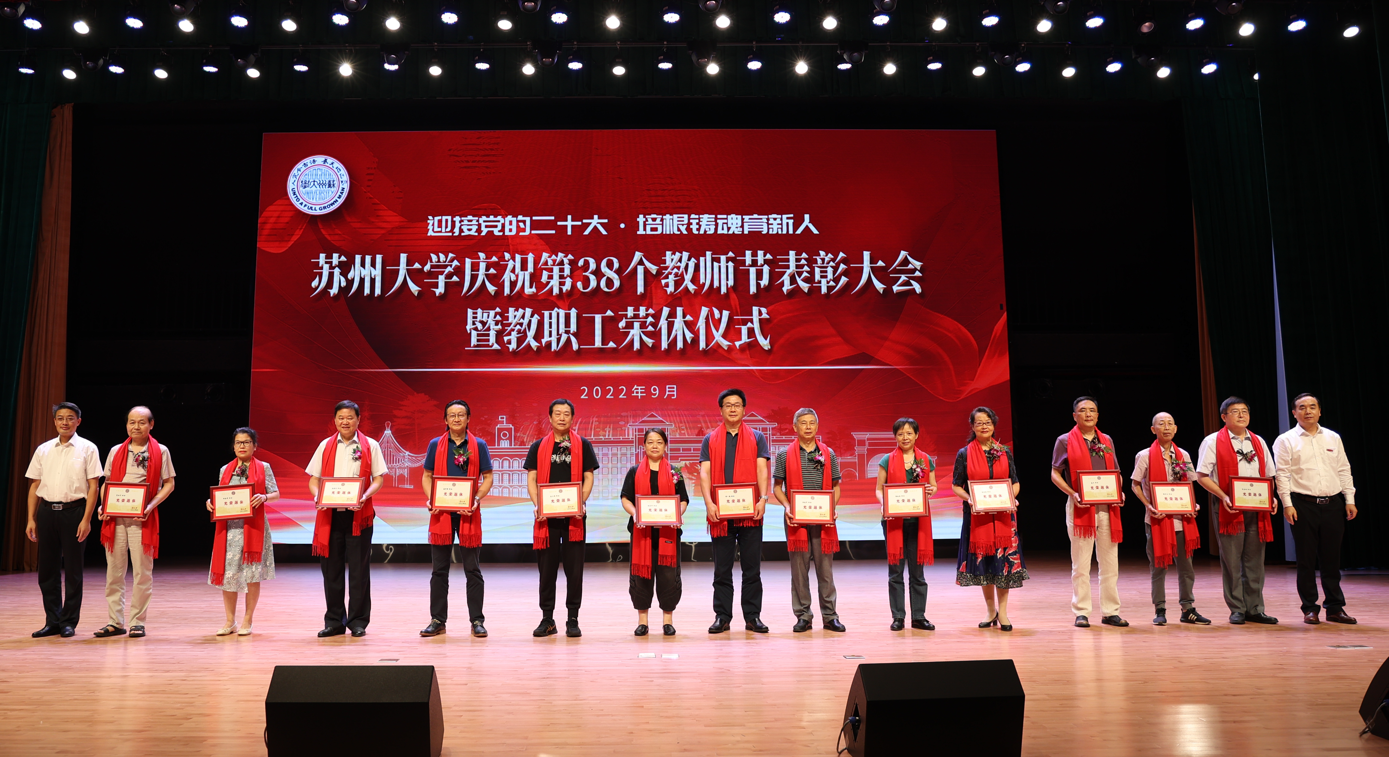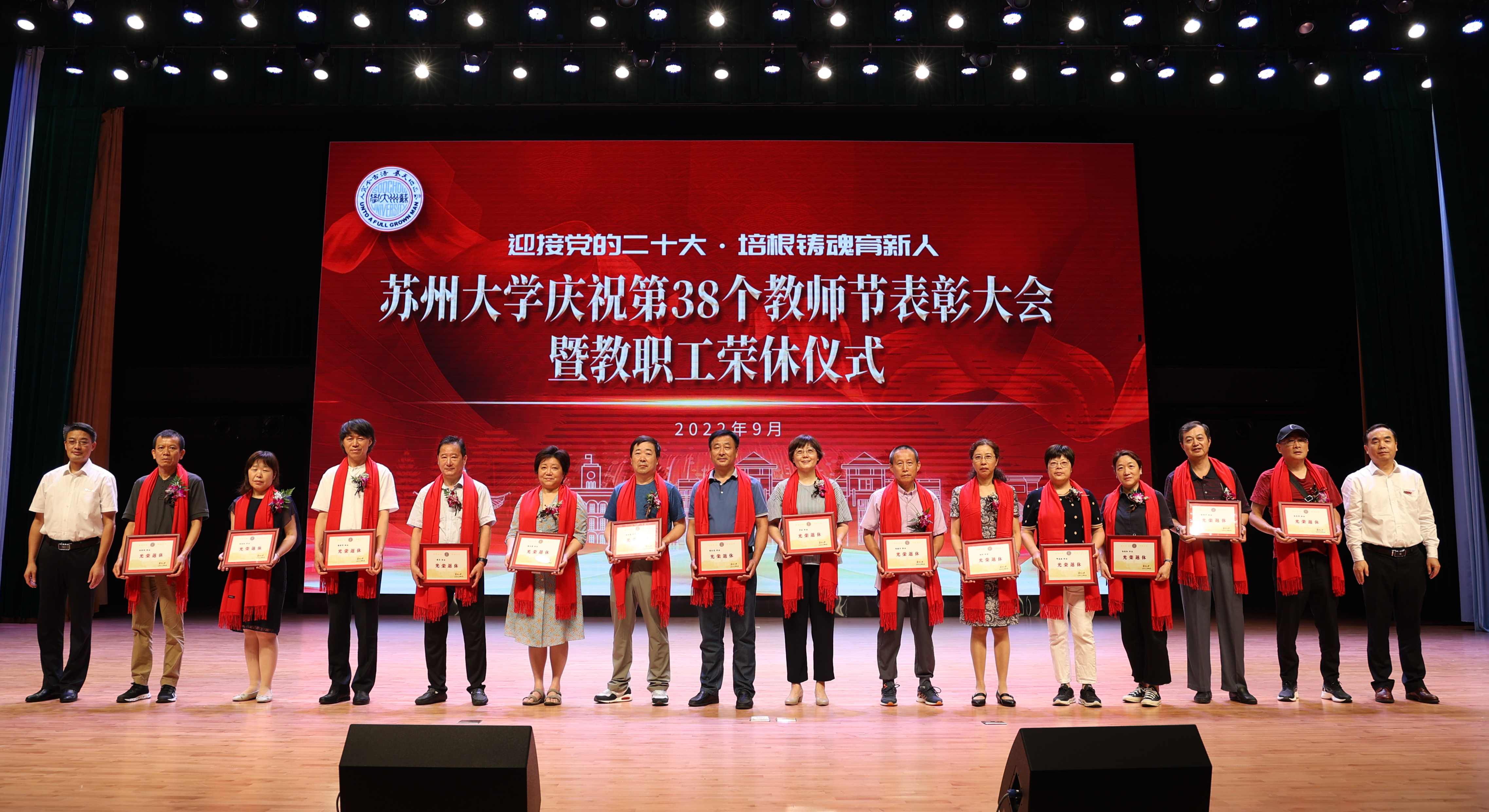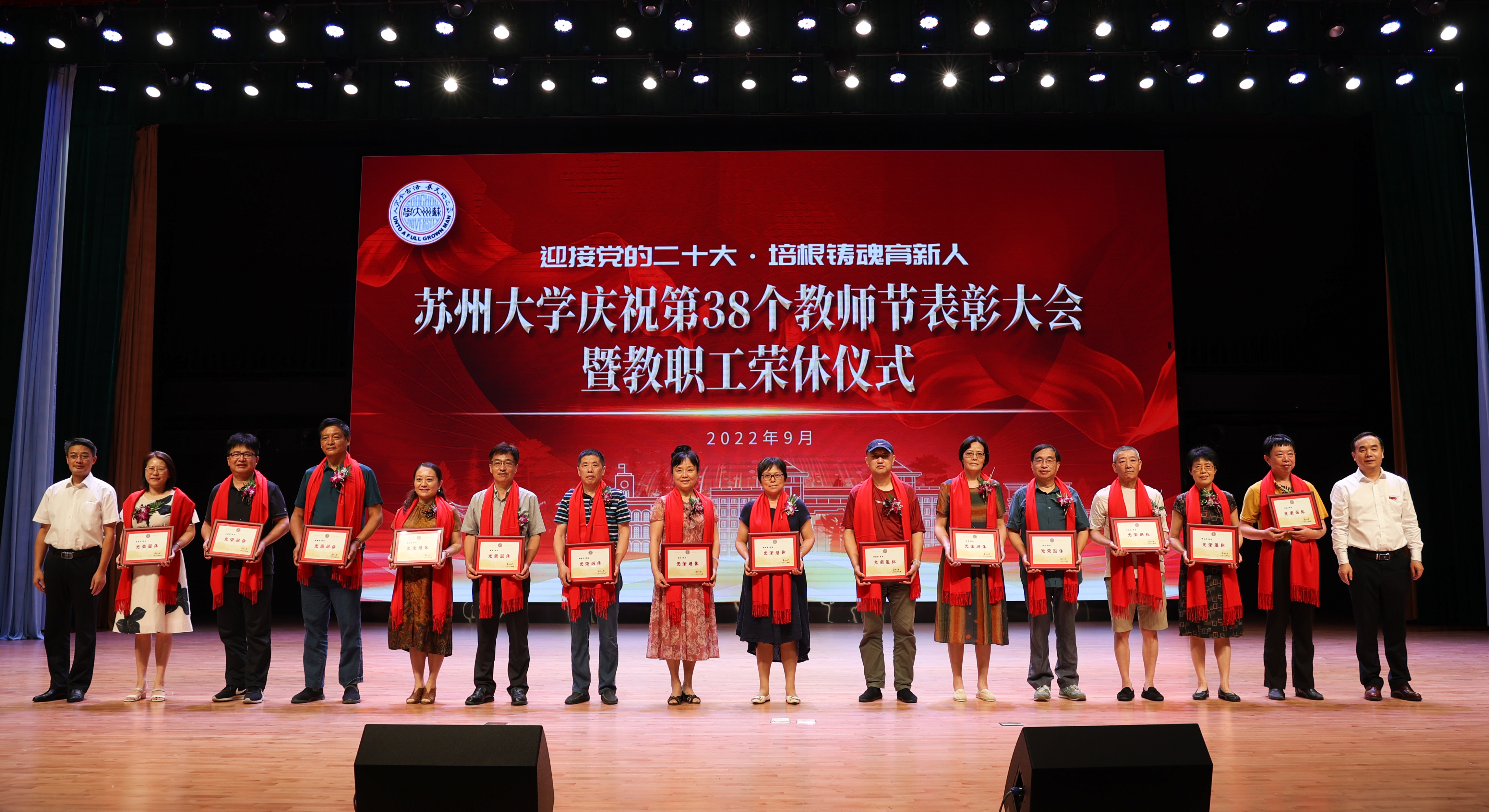鄧敏宣讀了2022年度蘇州大學高尚師德獎教金獲獎名單、2022年度蘇州大學“興育新”宣傳思想政治工作獎獲獎名單、從事教育工作滿30年教職工名單和榮休教職工名單。校黨委常委、副校長姚建林宣讀了近一年來學校、教師在省部級以上的主要獲獎名單。張曉宏、鄧敏逐一為獲獎教師頒發證書并合影留念。
