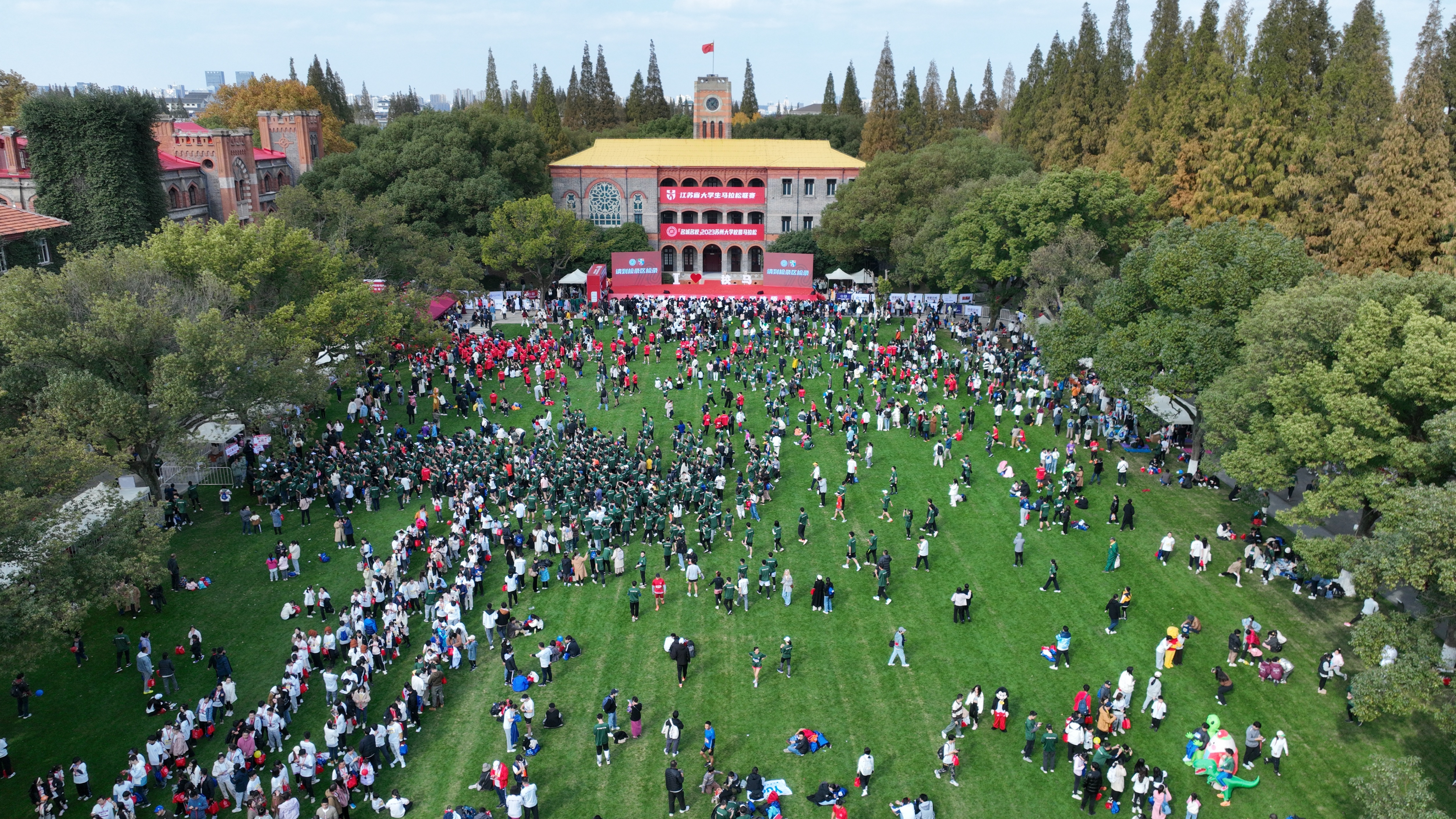 在激動澎湃的音樂聲中,參賽者紛紛在鐘樓前草坪集合。歌舞、啦啦操、舞龍舞獅,蘇大學子和蘇大幼兒園的小朋友帶來了精彩表演為跑者們加油打氣。出席活動的領導和嘉賓上臺,共同為“名城名?!?023蘇州大學校園馬拉松賽暨江蘇省大學生馬拉松聯賽各項賽事鳴笛發槍。