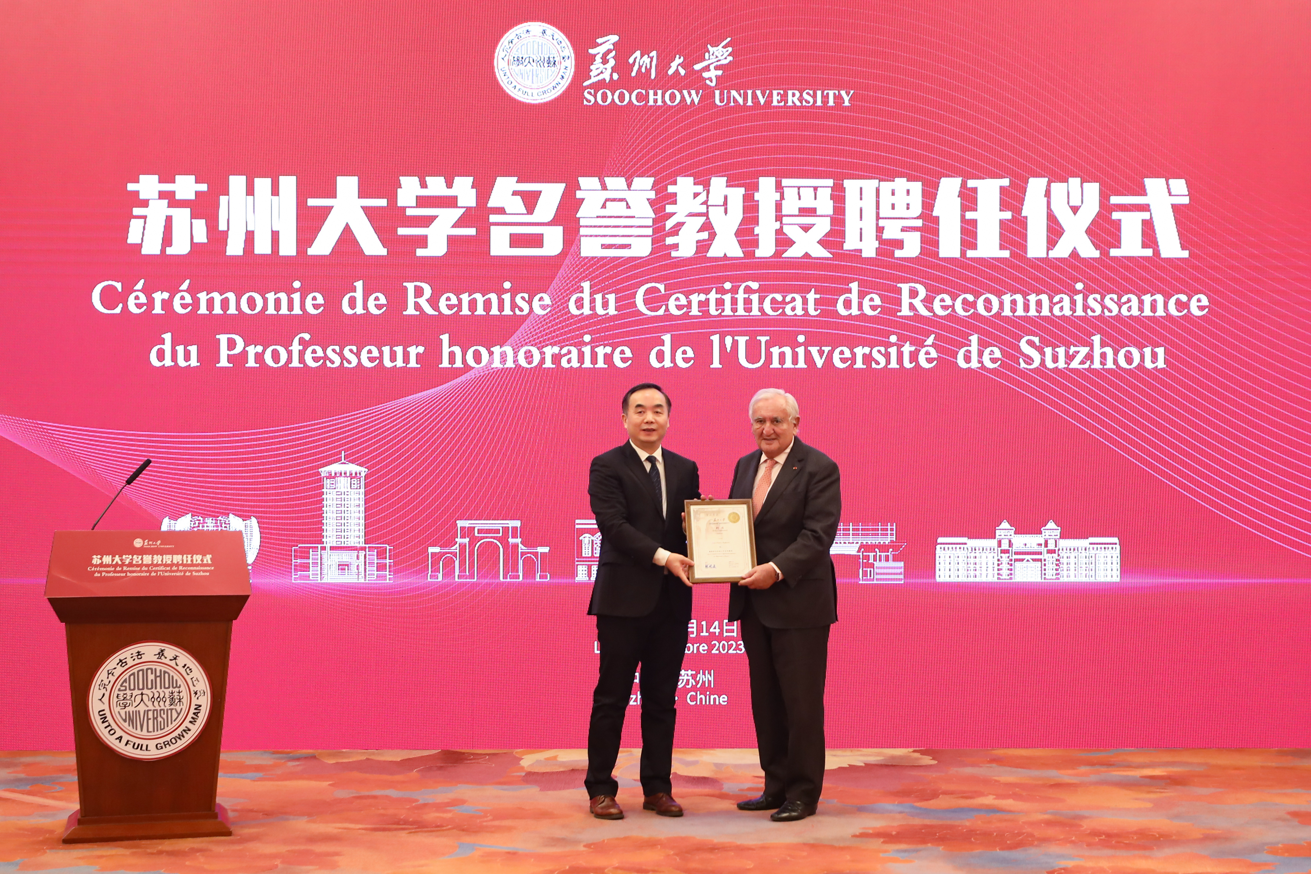 拉法蘭對受聘為蘇州大學名譽教授表示非常榮幸,對學校取得的發展成績表示欽佩。他指出,蘇大辦學歷史悠久,文化底蘊深厚,作為一所綜合性研究型大學,學校近年來科研水平不斷提升,國際影響力顯著增強。法國高校及相關研究機構與蘇大在科技、教育等領域開展了一系列卓有成效的合作,有著非常良好的合作基礎。拉法蘭表示,明年恰逢中法建交60周年,他將珍惜這份榮譽,努力為學校搭建交流平臺,積極拓展合作空間,特別在衛生健康、環境保護、人工智能等方面引薦更多的交流與合作機會,為攜手應對全球性挑戰貢獻智慧和力量。